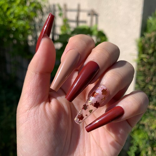 Maroon Leave Press On Nails Autumn Press On Nails Fall Etsy